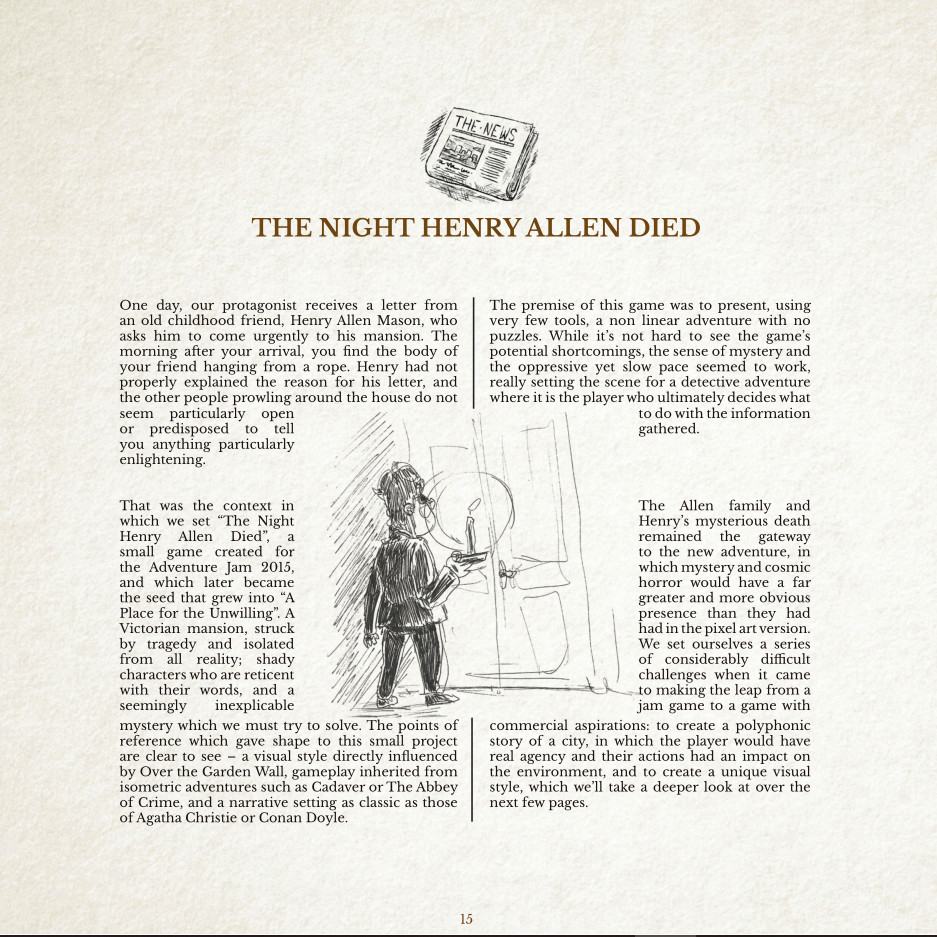 Get all the insights of the development of A Place for the Unwilling with this Digital Artbook featuring images of the whole process, from the pixel art prototype and the hand-drawn sketches to the final game artwork. Get to know the characters and the darkest alleys of The City, accompanied by the descriptions and commentary of Rubén Calles (Art Director) and Ángel Luis Sucasas (Narrative Designer).