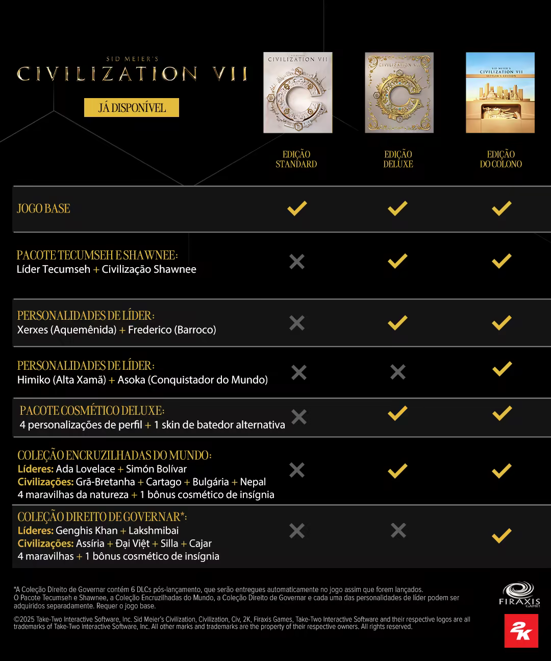 *É necessário ter uma conexão à internet e uma Conta 2K vinculada à conta da plataforma usada para jogar Civilization VII. As Contas 2K são gratuitas. Só é válida uma por Conta 2K. A recompensa será entregue automaticamente no jogo. Inválido onde for proibido. Os termos se aplicam.