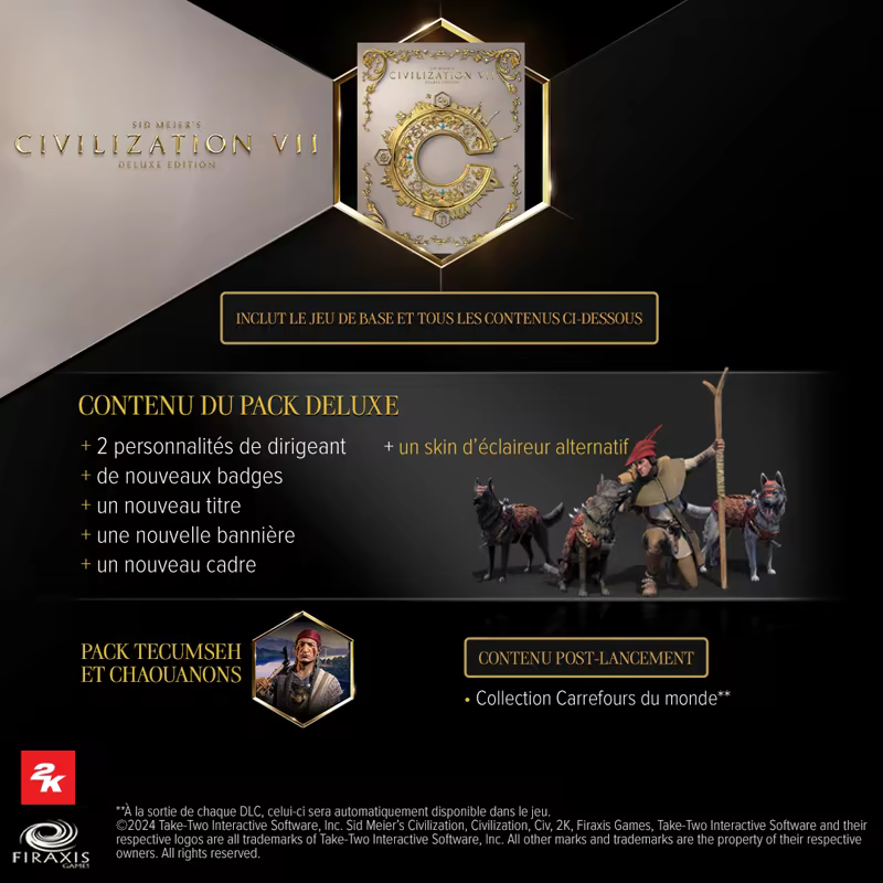 *Nécessite une connexion à Internet et un compte 2K associé au compte que vous utilisez pour jouer à Sid Meier's Civilization VII. Créer un compte 2K est gratuit. Un exemplaire par compte. Les récompenses seront automatiquement attribuées dans le jeu. Offre nulle là où la loi l’interdit. Voir conditions.