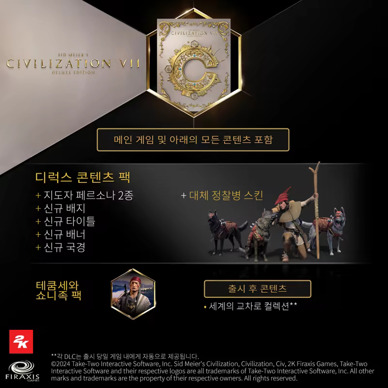 시드 마이어의 문명 VII 개척자 에디션은 방대한 추가 콘텐츠를 통해 문명을 처음 접하는 플레이어가 역사를 가로지르는 여정을 시작하기에 완벽한 출발점을 제공합니다. 시드 마이어의 문명 VII 스탠다드 또는 디럭스 에디션을 보유 중이라면, 개척자 에디션에 포함된 DLC를 개별 구매하실 수 있습니다.