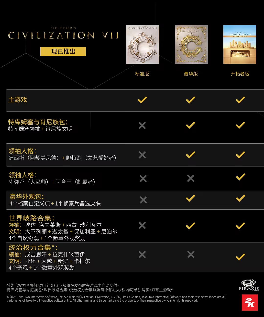 《席德·梅尔的文明VII》开拓者版是新玩家开启历史征程的理想选择,内含海量额外内容。如果你已拥有《席德·梅尔的文明VII》标准版或豪华版,可单独购买开拓者版包含的DLC。