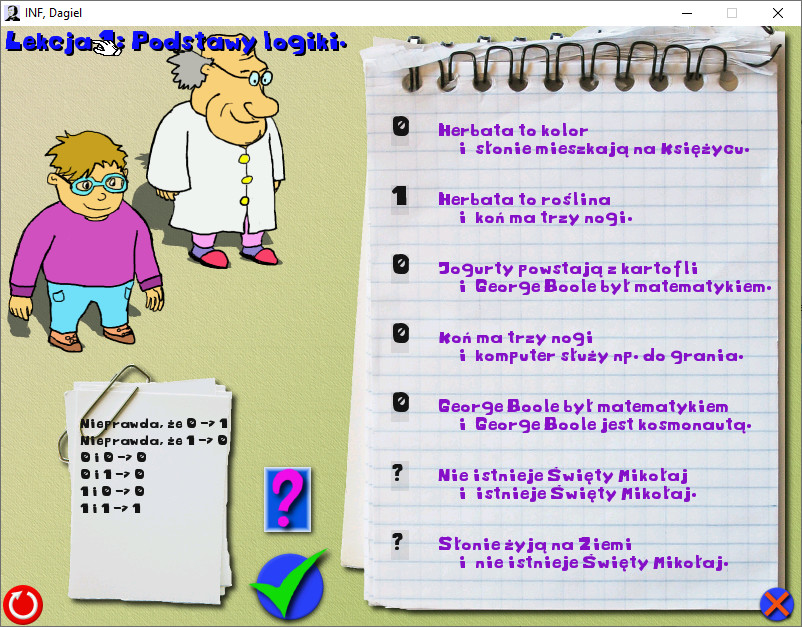 • W pierwszej lekcji użytkownik określa prawdziwość zdań i na ich przykładzie poznaje podstawowe operacje logiczne.