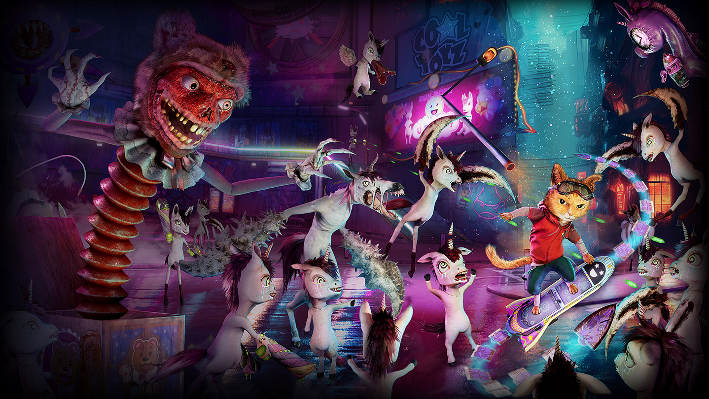 Von Neon-Städten und Spielzeugfabriken voller tödlichem Gift, bis zu verdorbenen Rummelplätzen und dem Inneren von Arcade-Maschinen – jedes Level ist voll mit tödlichen Gefahren und mutierten Spielzeugen, die deine Fähigkeiten im Kampf und dein Geschick an die Grenzen bringen.