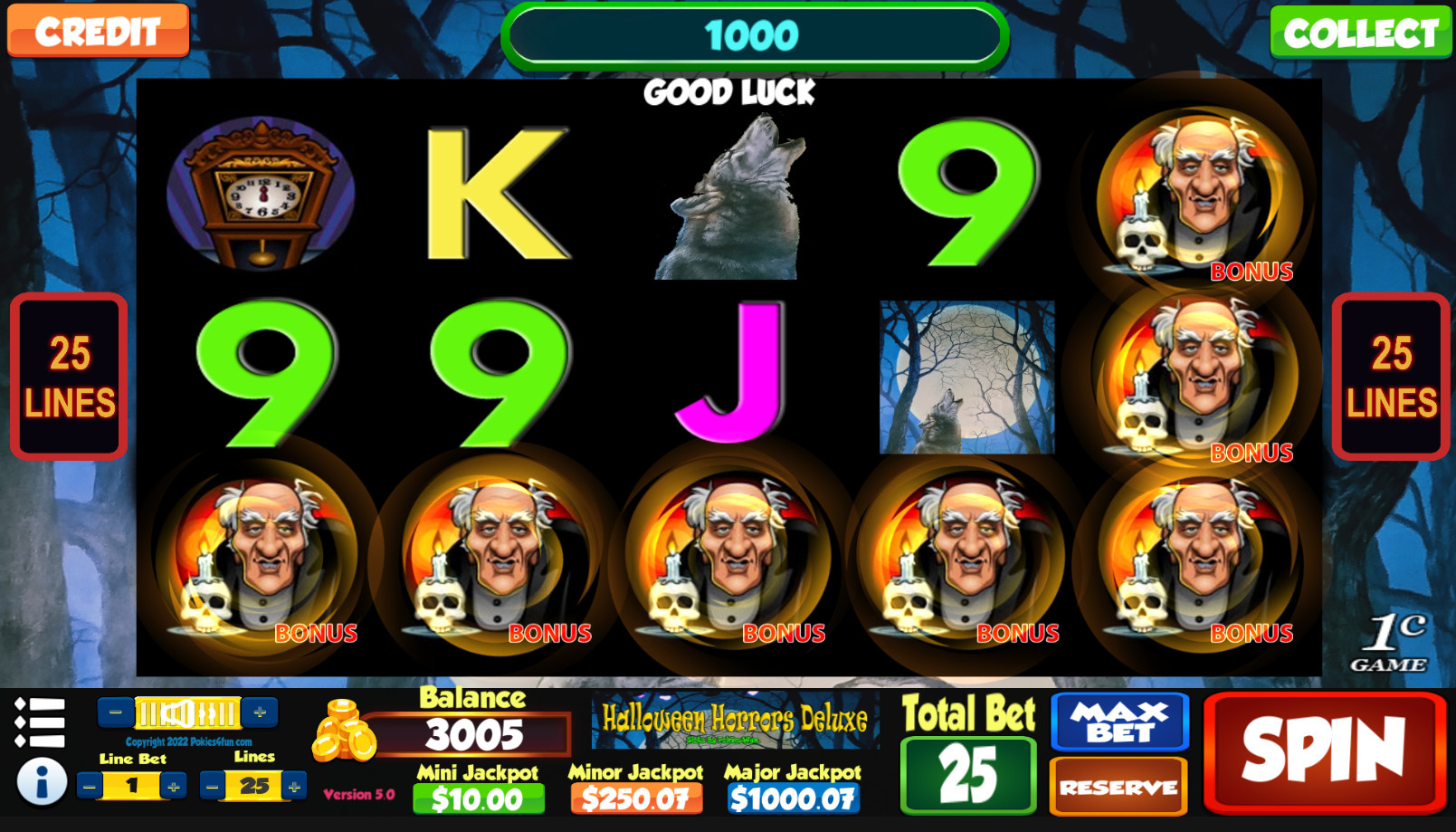Halloween Horrors Deluxe is a 5 reel, 25 payline slot machine (pokie) with a Scary theme oriented from left to right.