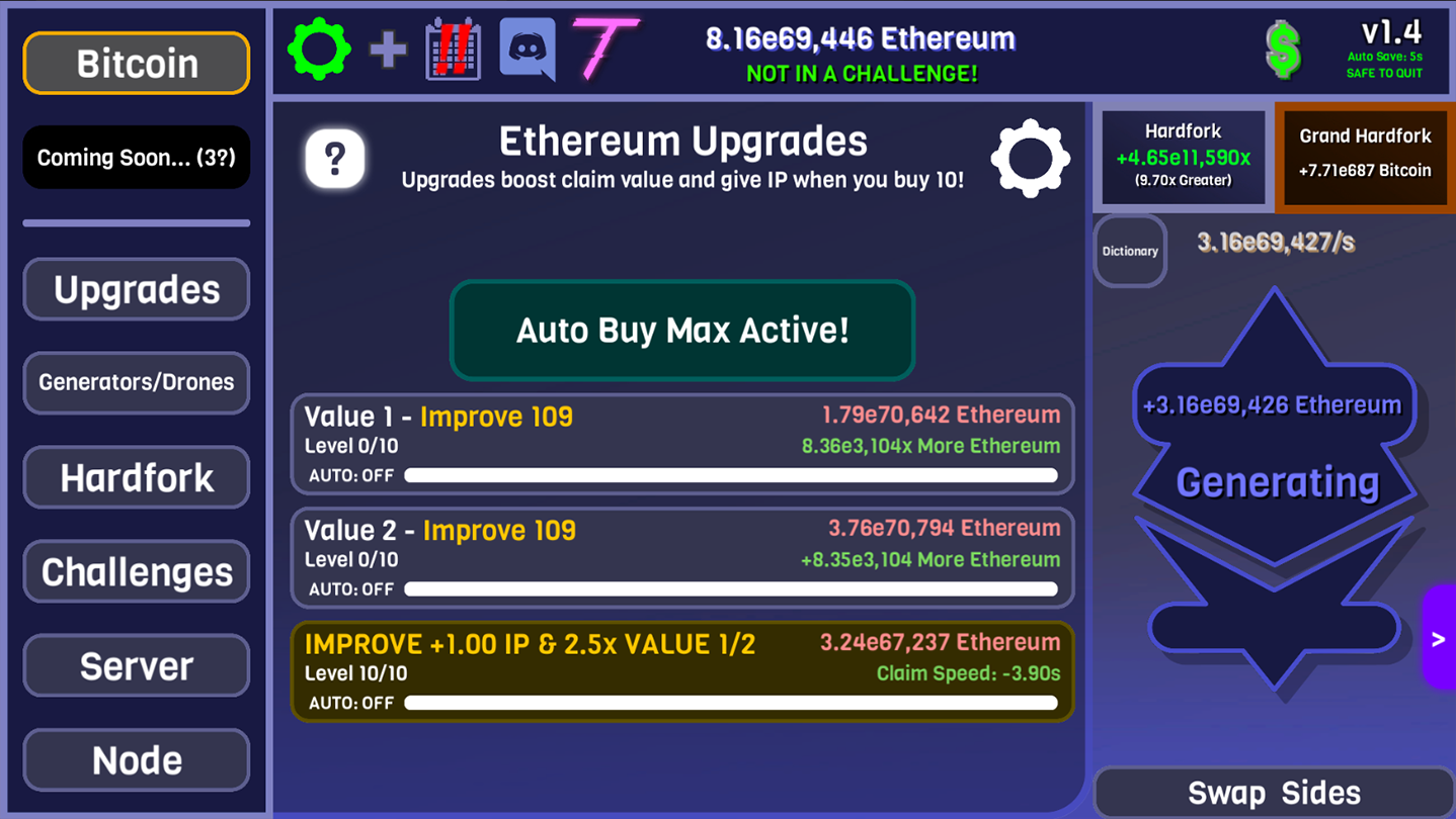 CryptoClickers is a complex Idle/Clicker Game revolved around Cryptocurrencies that's full of unique game modes, upgrades, challenges, events, and a double layer prestige system!