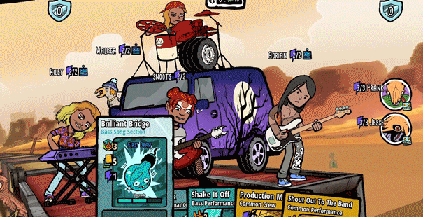 Pick between Guitar, Bass, Keyboard, or Drums. Build your deck with hundreds of unique cards and discover special Reign-specific cards. Between your shows you can upgrade your cards, refine your deck and coordinate your next move.