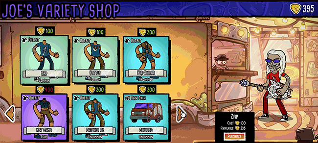 • Pick your clothes, gear, van, van buddy and customize your band in hundreds of ways.