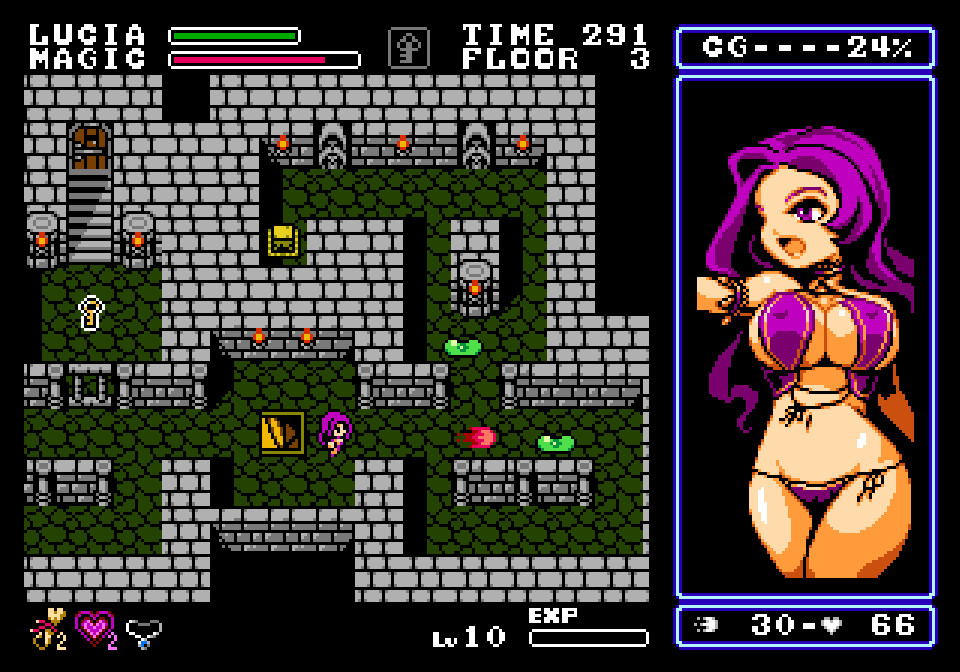 A succubus wielding a holy sword is on an adventure to defeat the king of demons! Solve puzzles and encounter monsters all while enjoying erotic events as you conquer the dungeons! By obtaining magic and items, you can go places that you had previously been unable to reach! Gain the ability to push heavy objects, to set things on fire... Explore every nook and cranny of the map!