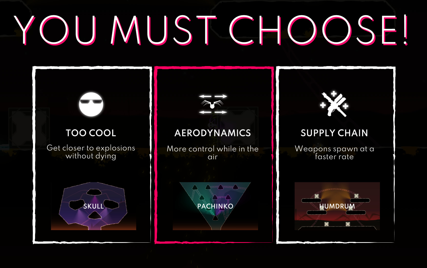 Each arena has its own unique features, and while some may help you, others will bring the pain. You're welcome to come up with a strategy in the beginning and stick to it, but you don't have to—just let inertia and random chance make your gameplay unpredictable.