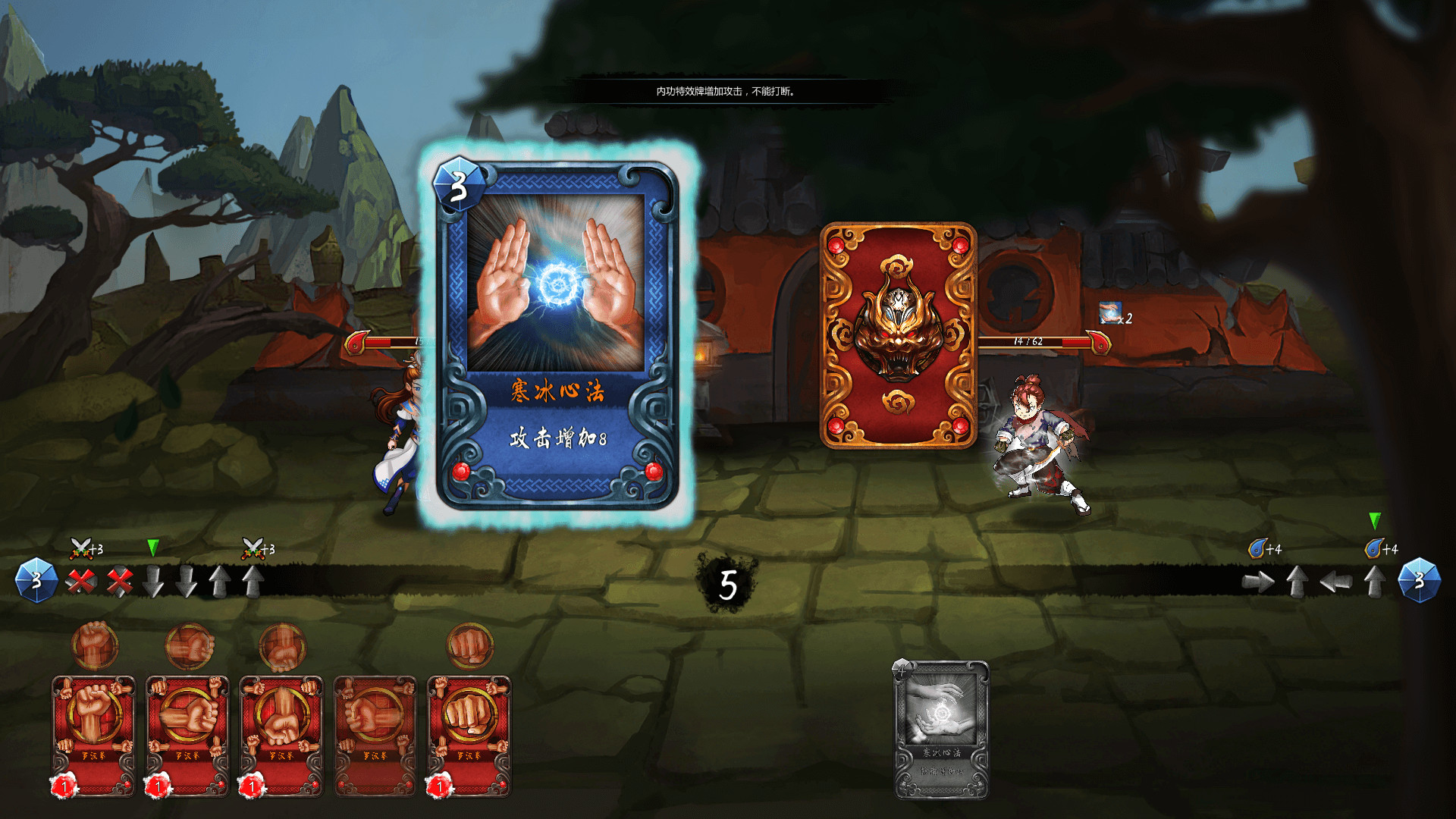 游戏的战斗借鉴了五元素互克的猜拳规则。每个元素既克两个元素,又被另外两个元素克。战斗时配合武功的特效和大招,模拟临阵激斗的武侠对决。