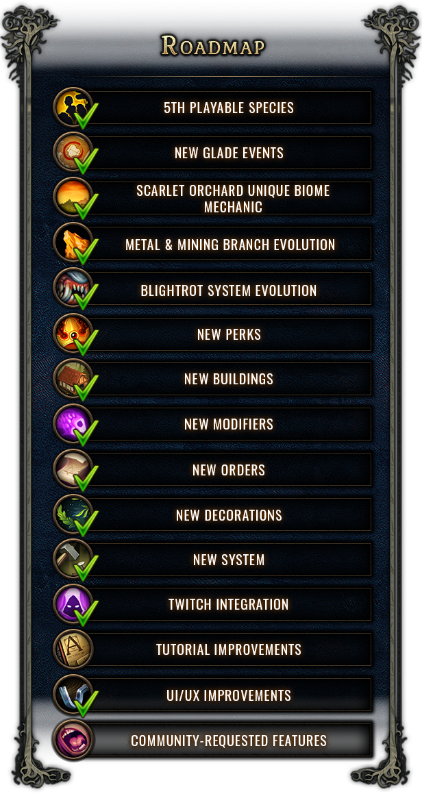 “We plan for the full version of Against the Storm to have additional features guided by community input. Our current plans include adding a fifth playable species, as well as new events, perks, buildings, modifiers, and orders. You can find more detail on these plans at our Early Access Roadmap.”