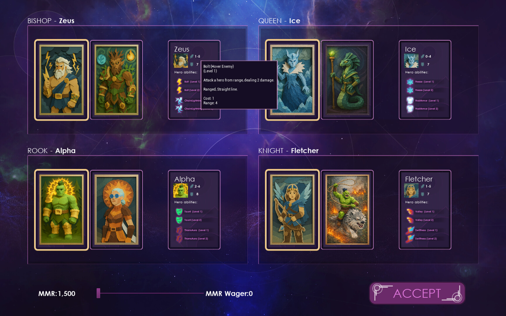 Pick four heroes from a roster of eight. Each belongs to one of four ancient classes — Bishop, Queen, Rook, and Knight. Each carries abilities that can turn the board inside out. The draft alone is a game within the game.