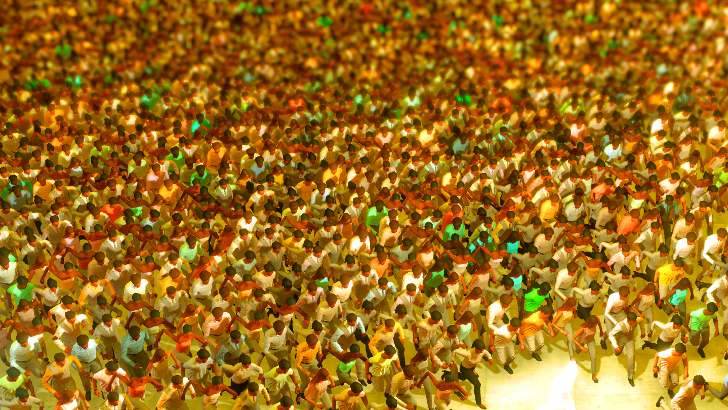 The crowd’s movements are programmed to simulate intelligent behaviours (including avoidance, following and mimicry), reflecting the seemingly endless ways that humans act in group settings. Viewed from above, these movements create mesmerising patterns against the landscape. A shaft of light beckons you – each time you reach the light, this landscape shifts, along with its soundtrack, gravity, atmosphere and mode of movement.