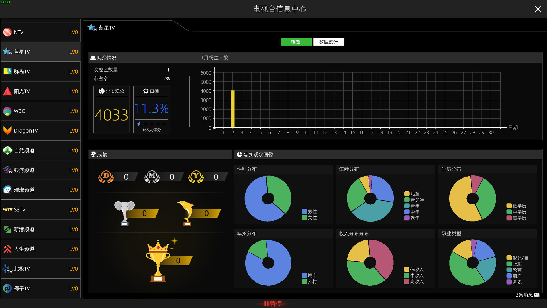 电视台模拟国是一款融合了探索,建造,数值养成等玩法的模拟经营游戏。您将扮演某处小电视台的新任台长。在广阔的大洲王国中,同其他电视台争夺天下。您可以通过多种方式做大做强自己的电视台,比如合理编排节目,拔高收视率,策划王牌综艺节目,高价拍卖节目首播权。打造精彩的新闻节目,一举收获天价广告赞助。还可以扮演星探,发掘大洲王国的下一个顶流艺人!