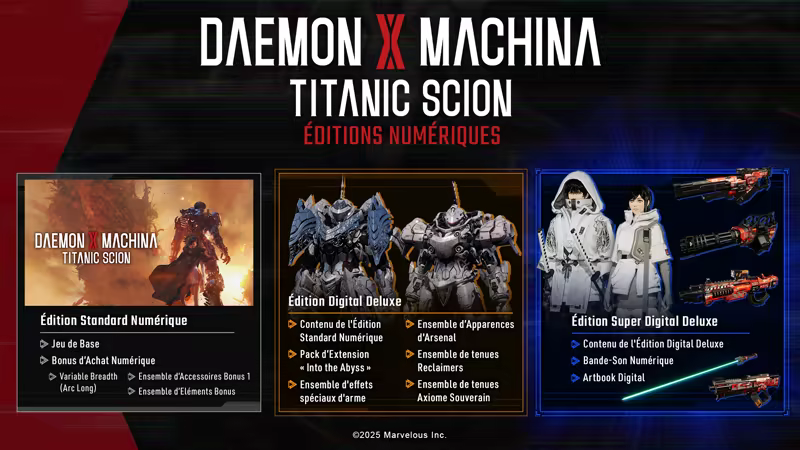 L'Édition digital deluxe et super digital deluxe de Daemon X Machina: Titanic Scion comprennent toutes deux le jeu de base ainsi que de DLC supplémentaire à sortir sur plusieurs mois. L'Édition super digital deluxe comprend aussi un artbook et une bande originale numériques, pour une vision plus riche et détaillée du monde de Daemon X Machina: Titanic Scion.