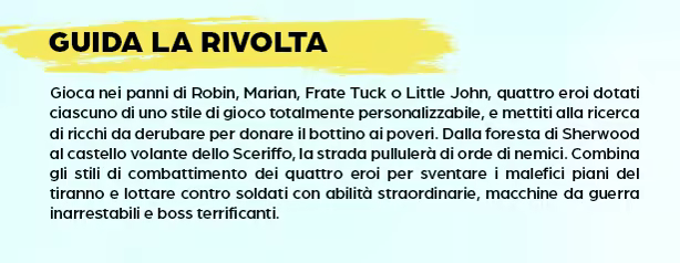 Affronta gli uomini dello Sceriffo di Nottingham e guida la rivolta in modalità 1P o co-op fino a 4P. Impersona uno degli Allegri compagni, esegui potenti combo e libera gli oppressi in questa storia distopica ispirata alla leggenda di Robin Hood.