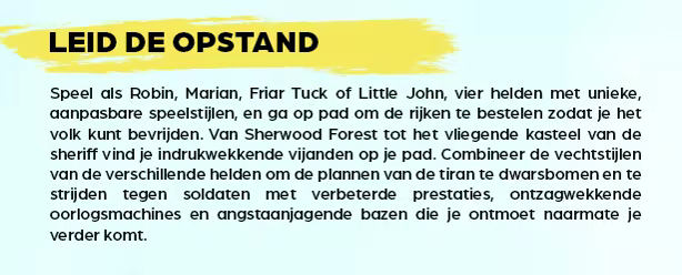 Vecht tegen het leger van de sheriff van Nottingham, alleen of met maximaal vier andere spelers. Speel als een van de Merry Men, combineer je aanvallen en bevrijd het volk in deze futuristische dystopie geïnspireerd door de legende van Robin Hood.