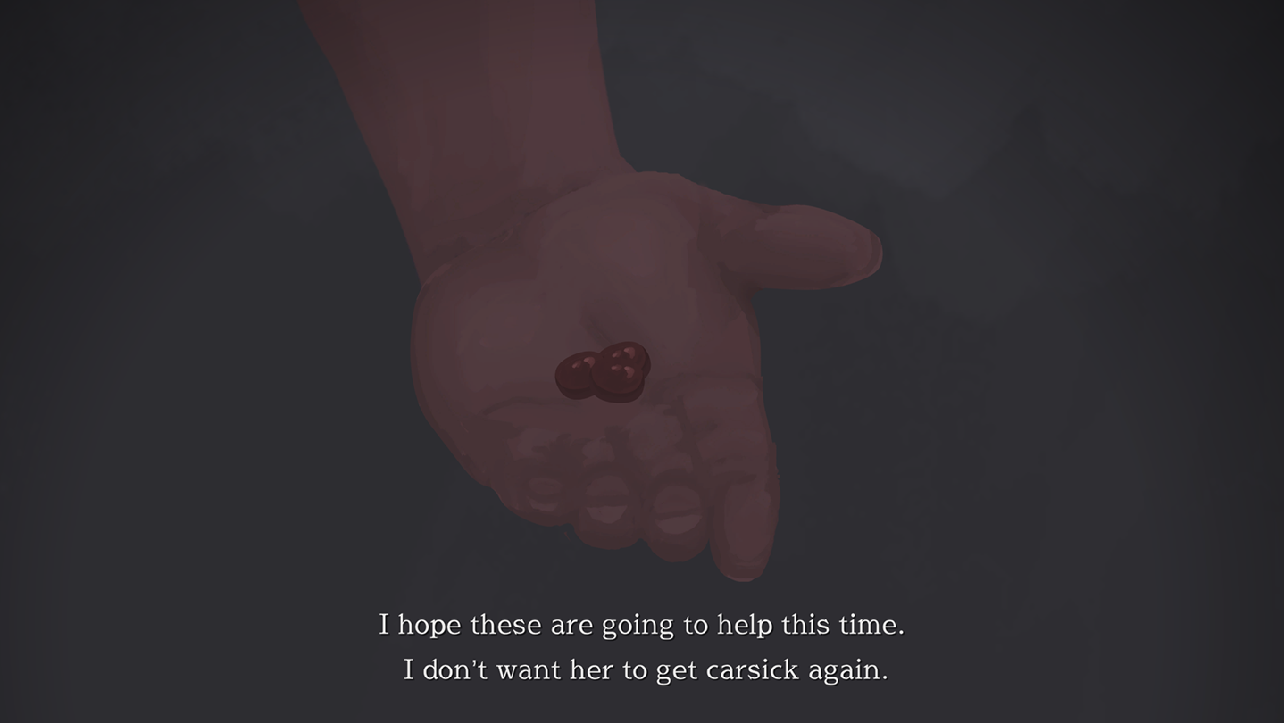 “A Lozenge” is a short interactive story about motion sickness, dedicated to children of divorce. In the format of a 10-minute visual novel, it lets the player join Lucy and Michelle on their mother-daughter road trip.