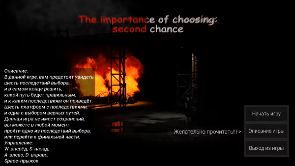 TIOC: second chance- a game which is designed for a peaceful passing, along with the main character you will face the consequences of a choice, which in the final will help you to make the right decisions, so you have the opportunity not to just take the consequences, and to explore the area and be aware of the challenges took place, the main character, and why she had to undergo these difficulties, you will be able to control your character, view a map of the main platform, and a flashlight that will illuminate your path. Each consequence is different from each other, the variety of terrain, its own history, its own end of history, and more. Consequences of refusing to study, trusting strangers, excessive faith in loved ones, the consequence of using prohibited substances. in the final part, you have the freedom of choice. The game has several endings, and it all depends on which path you choose.