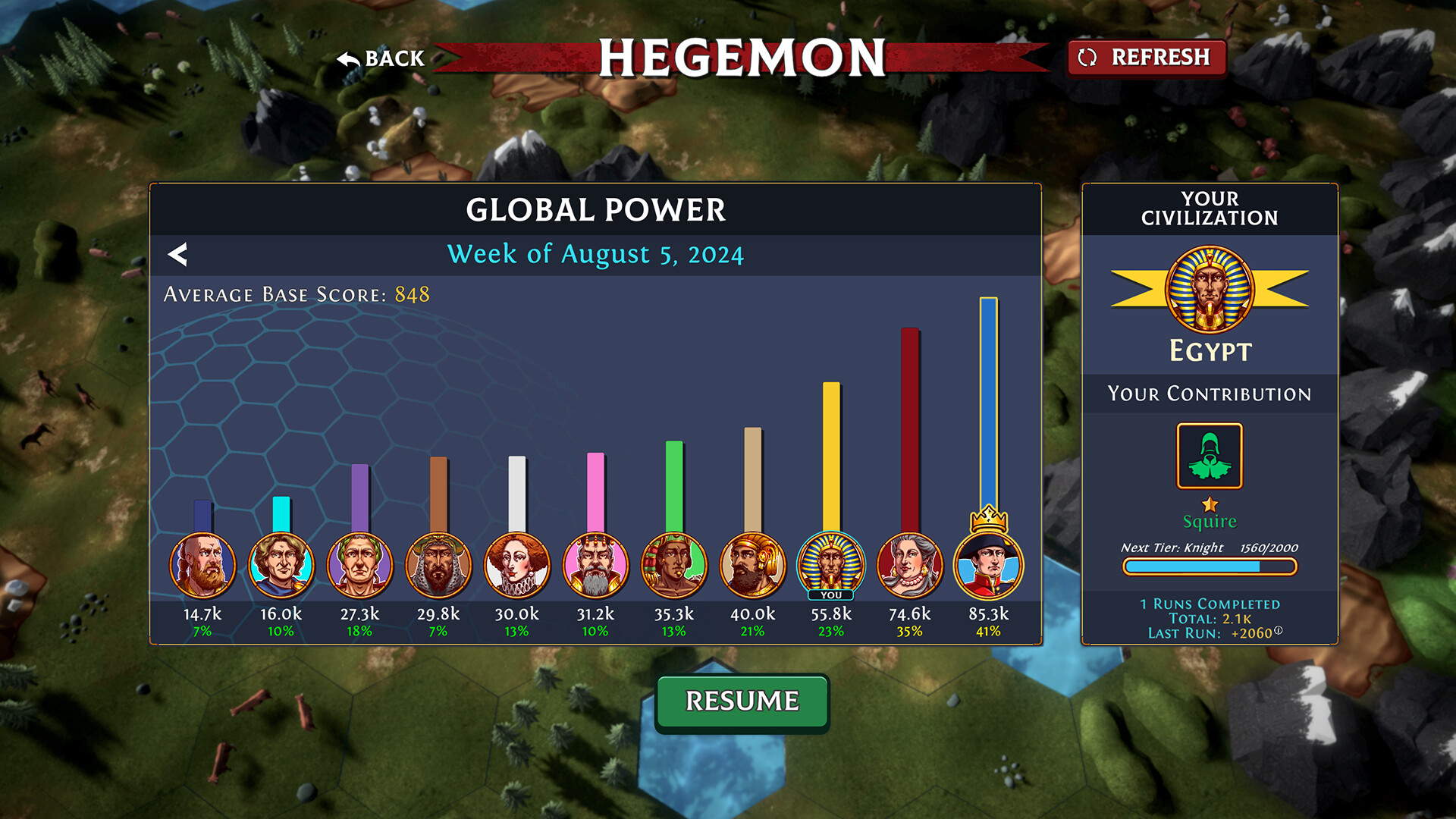 • Weekly Hegemon Challenge - Choose a civilization and cooperate with all other players that chose that civilization this week. Complete randomly generated single-player campaigns to make your civilization the Global Hegemon for the week.