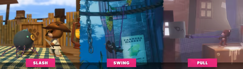 Always prepared for a challenge, Stuffy can take down foes and interact with the environment in several exciting ways! Push things around, climb along ledges, crawl through narrow openings... or use the Needle 'n Thread to slash down enemies and obstacles, swing across gaps, and pull things toward you!