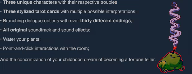 In Cartomante, play one afternoon in the life of the mystic Miss Cartomante, a witch with the very important job of giving somewhat accurate and foretelling card readings to the eccentric residents of the Metropolis and helping solve their highly questionable problems.