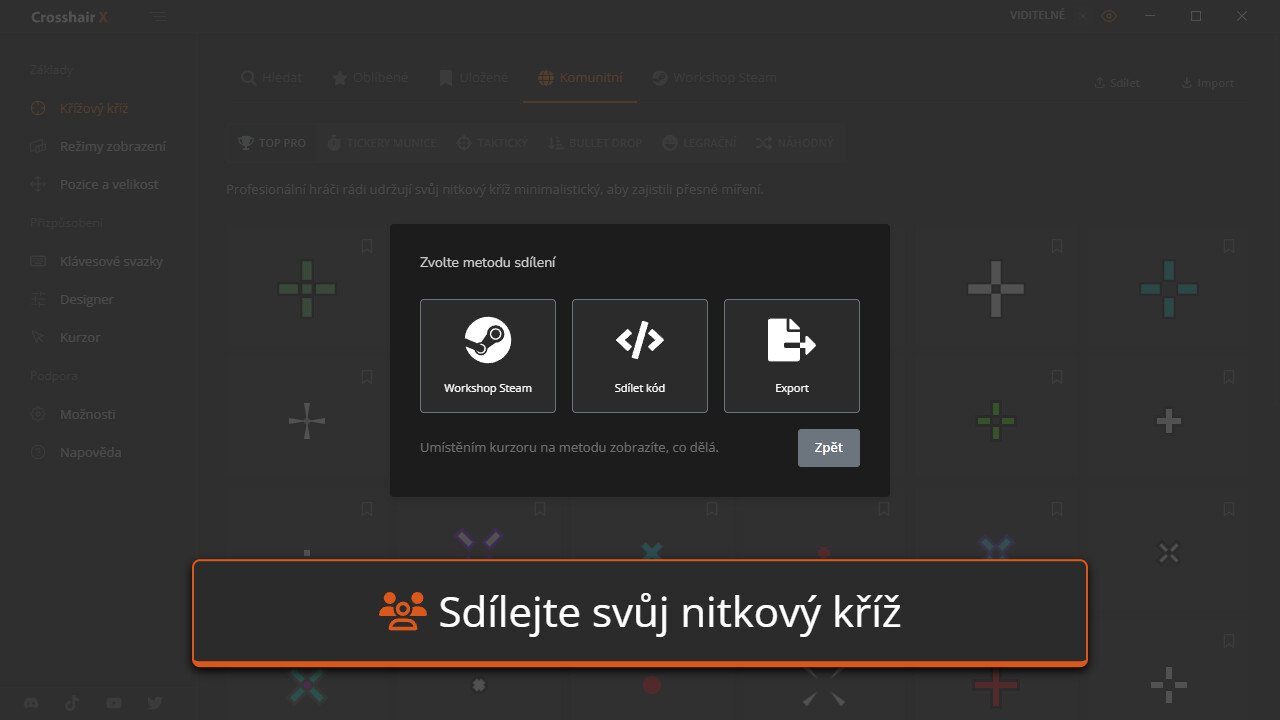 • Komunita: Prozkoumejte tisíce návrhů vytvořených komunitou Crosshair X