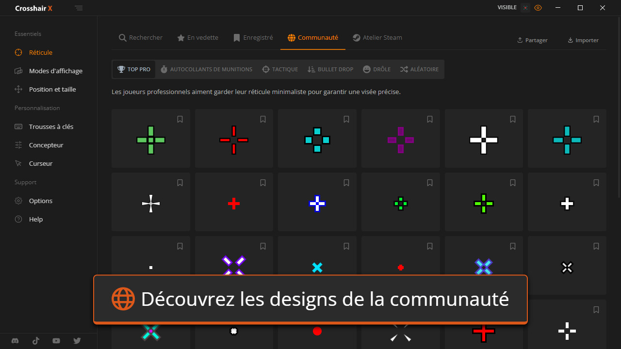• Communauté: Explorez des milliers de designs créés par la communauté de Crosshair X