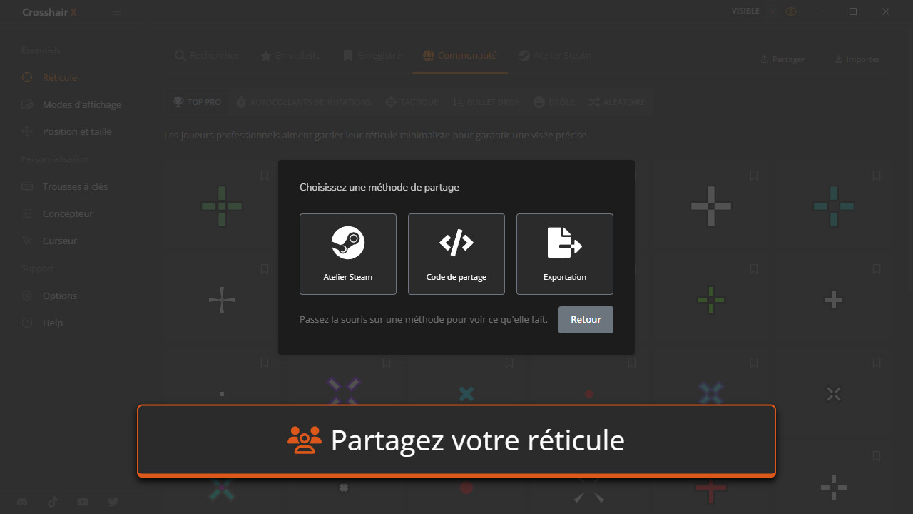 • Communauté: Explorez des milliers de designs créés par la communauté de Crosshair X