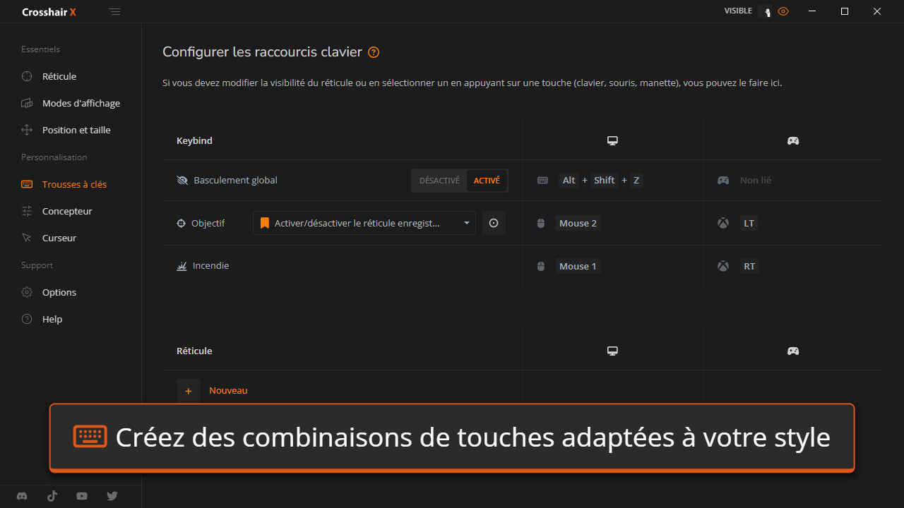 • Basculer: Basculer la visibilité de votre réticule avec de nombreux états de souris et raccourcis clavier différents
