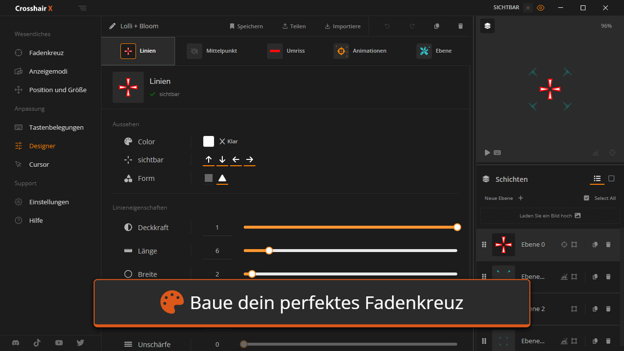 • Designer: Alle Funktionen deines Crosshairs lassen sich einfach mit Schiebereglern einfach anpassen