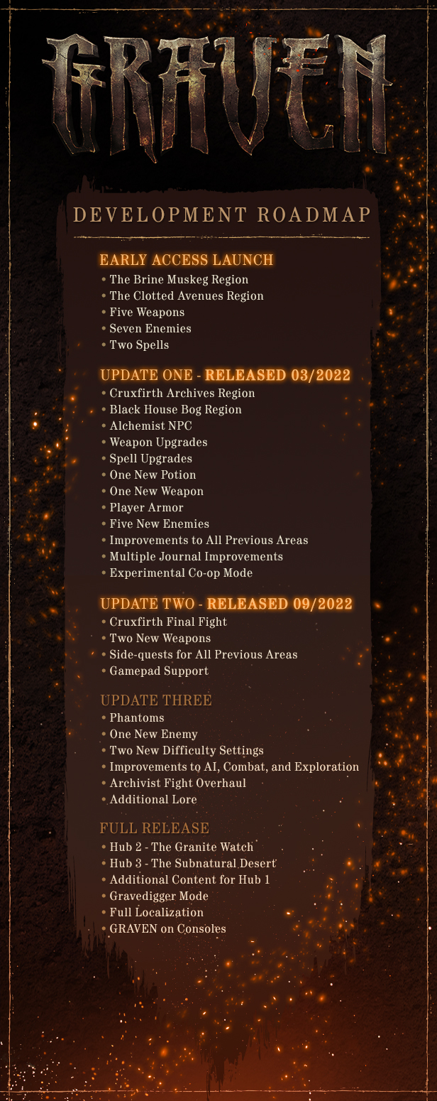 “The current Early Access version of GRAVEN includes 4 major areas, connecting spaces, 6 weapons, 2 spells, upgrades for both, and focuses on the primary quest line. The remaining updates include the boss fight, additional weapons, additional areas, side quests, and 2 weapons plus cosmetic improvements.”