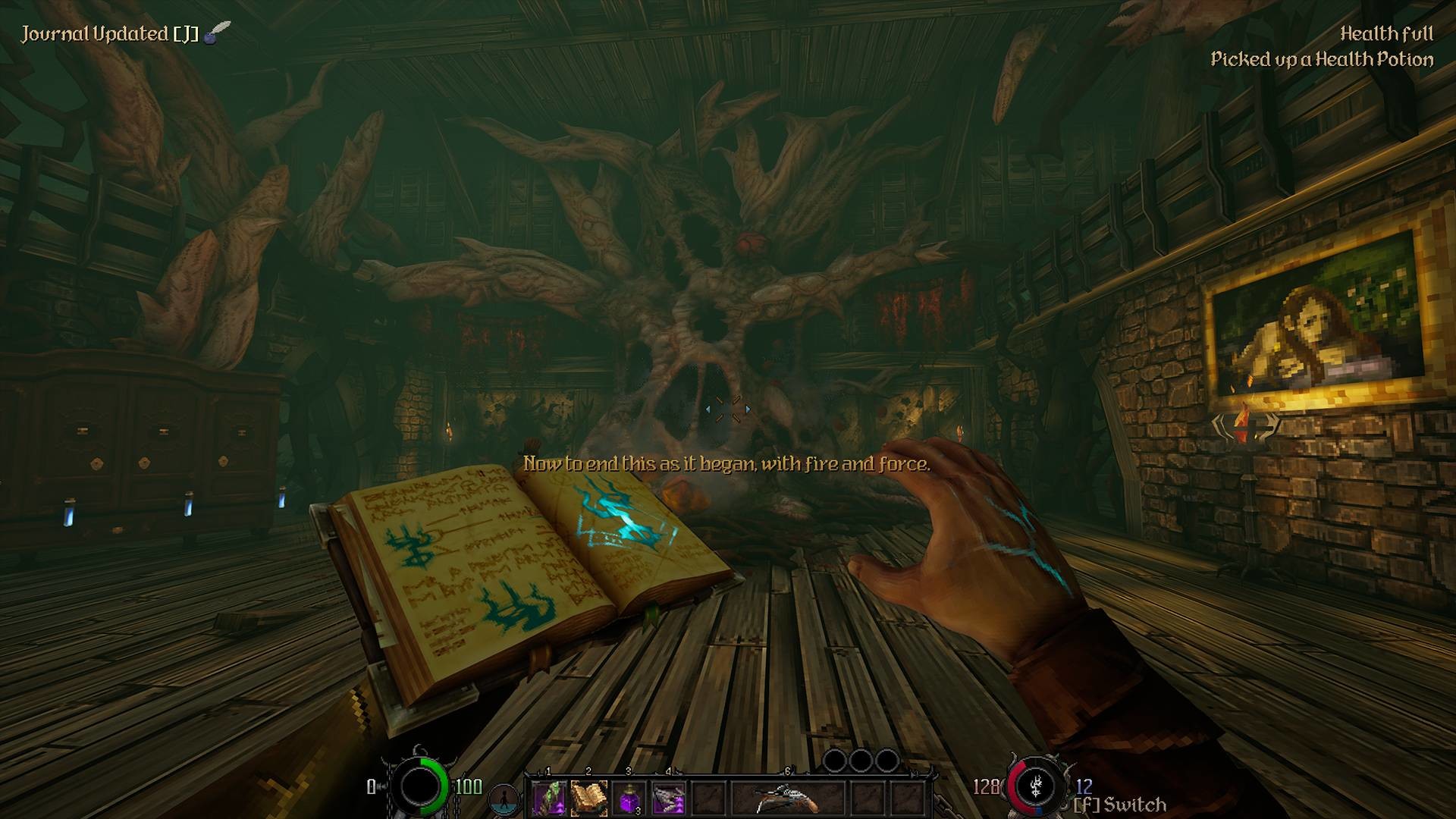 A faithful priest of the Orthogonal order, exiled unto death for a crime in defense of another, you live again in a small boat, adrift in a swamp. A stranger ferries you to solid ground and bestows upon you vague instructions, along with a mysterious staff and book. Go forth, pious priest, alleviate suffering, uncover deceptions, and smash the eldritch perversions encroaching upon reality itself.