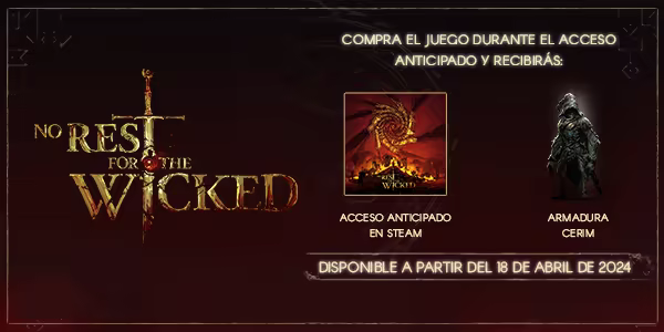 De Moon Studios, los creadores galardonados de Ori and the Blind Forest y Ori y the Will of the Wisps, llega No Rest for the Wicked: un RPG de acción único y visceral ambientado en un mundo creado a mano, con un combate al estilo Souls donde cada golpe cuenta y cada aliado puede unirse a la lucha.