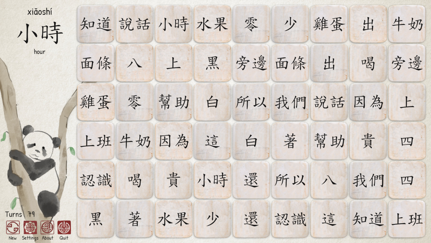 Increase your Chinese vocabulary with this classic and fun memory game. Learn to read either Simplified or Traditional characters, and listen to the pronunciation of each word to help you towards fluency.