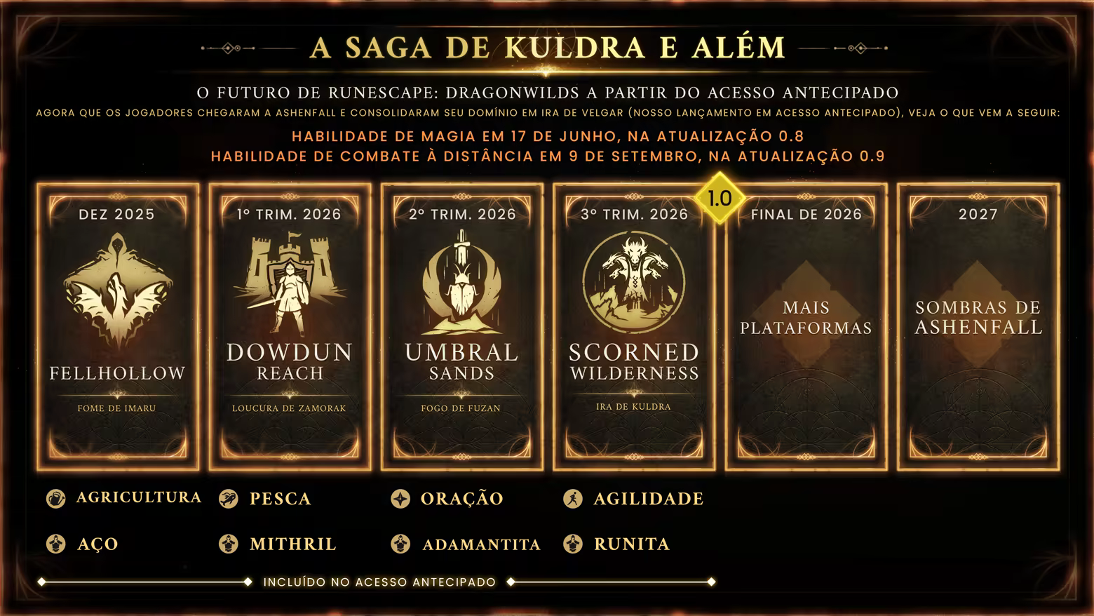 "Planejamos continuar adicionando mais sistemas, feitiços e habilidades para enriquecer a experiência em RuneScape: Dragonwilds. Haverá muitas novidades para curtir e explorar por conta própria ou com amigos: habilidades para aprimorar, missões para concluir, inimigos para enfrentar, novos eventos sazonais, recursos para usar e cofres para descobrir."