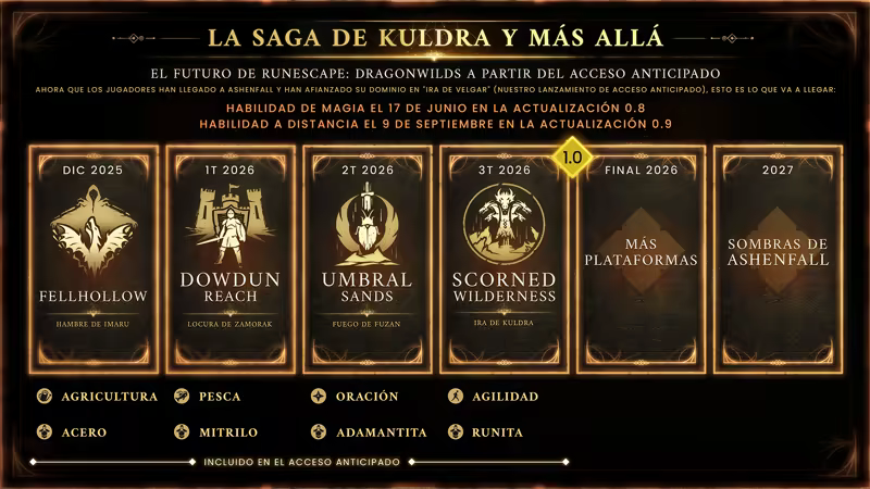 La idea es dar forma a RuneScape: Dragonwilds con los comentarios de los jugadores a cada paso del camino, ¡desde las versiones alfa hasta la 1.0 y más allá! El extenso continente de Ashenfall aún no se ha cartografiado, y lo que aguarda tras el velo sigue siendo un misterio... por ahora. Juntos, descubriremos sus secretos. Nuestra comunidad seguirá ayudándonos a trazar nuestro plan de desarrollo, un documento vivo que irá cambiando y adaptándose para que esta aventura sea la mejor posible. ¡Estamos impacientes!
