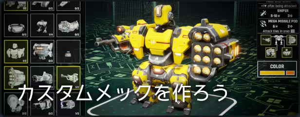 新しい戦術、メックデザイン、戦略をリスクなく試したい?好きなパーツを選べるサンドボックスへどうぞ。操縦を練習し、独自のロードアウトを試し、スウォームに対抗する戦略を練り上げましょう。
