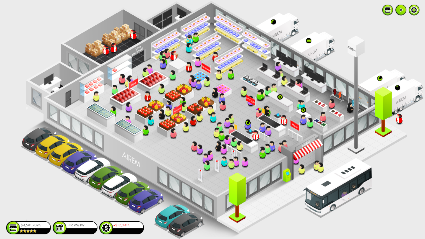 Shop Tycoon is a store simulator. Start with a small store, then build a huge store with parking lots, offices for employees, a huge fleet of cars.