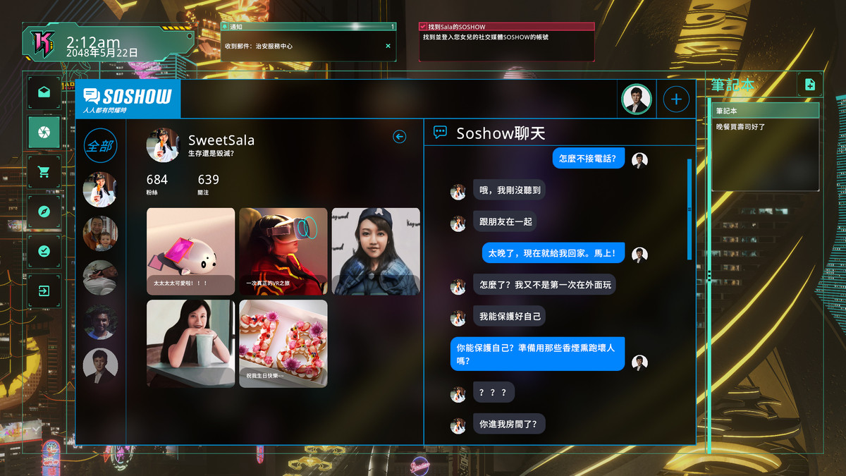 • 用望遠鏡觀察你所在的城市,探索城市中的秘密。遠處的房間也在望遠鏡的幫助下細節一覽無餘,整個城市都將成為你探索真相的一部分。在這個賽博城市中不停窺探,揭露出人們背後不為人知的真面目。