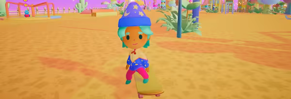 Magic Trick seeks to fulfill everyone’s greatest desire: being a skateboarding magician. The player embodies Sunset Isles’ newest resident: WizKid (pronouns: they/them), who can perform radical magic by using skate trick combos! The day is nearly over, but Wizkid wants to explore the town and meet their new neighbors before calling it a day. The twilight adventure begins at the skate park to hone their skills with skateboarding legend, Tony the Hawk. Tony teaches the player skating tricks ranging from a simple ollie to a gnarly backflip, while Wizkid’s magic allows the player to perform incredible feats such as skating at super speed, spawning a ramp from thin air, and flying to the top of the sky.