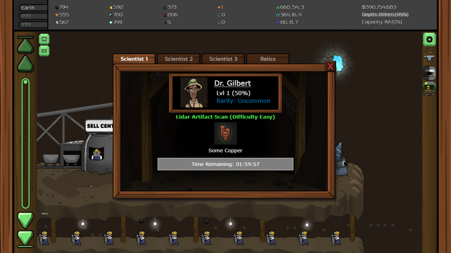 Hire scientists to find rare relics to help you progress further.