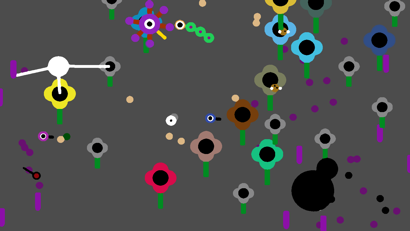 There are also many bugs, many robots, and even some environmental hazards such as fire and smog. Heck even the plants compete with other plants. Nothing is interested in you though: You're an immortal wind god! And you interact with everything by blowing things around and toggling behaviors by clicking on the huge amount of bugs, robots, and plants. Anything you see can be clicked. Through this somewhat indirect interaction you can ensure the survival of the garden. Though you don't have to interact a lot: