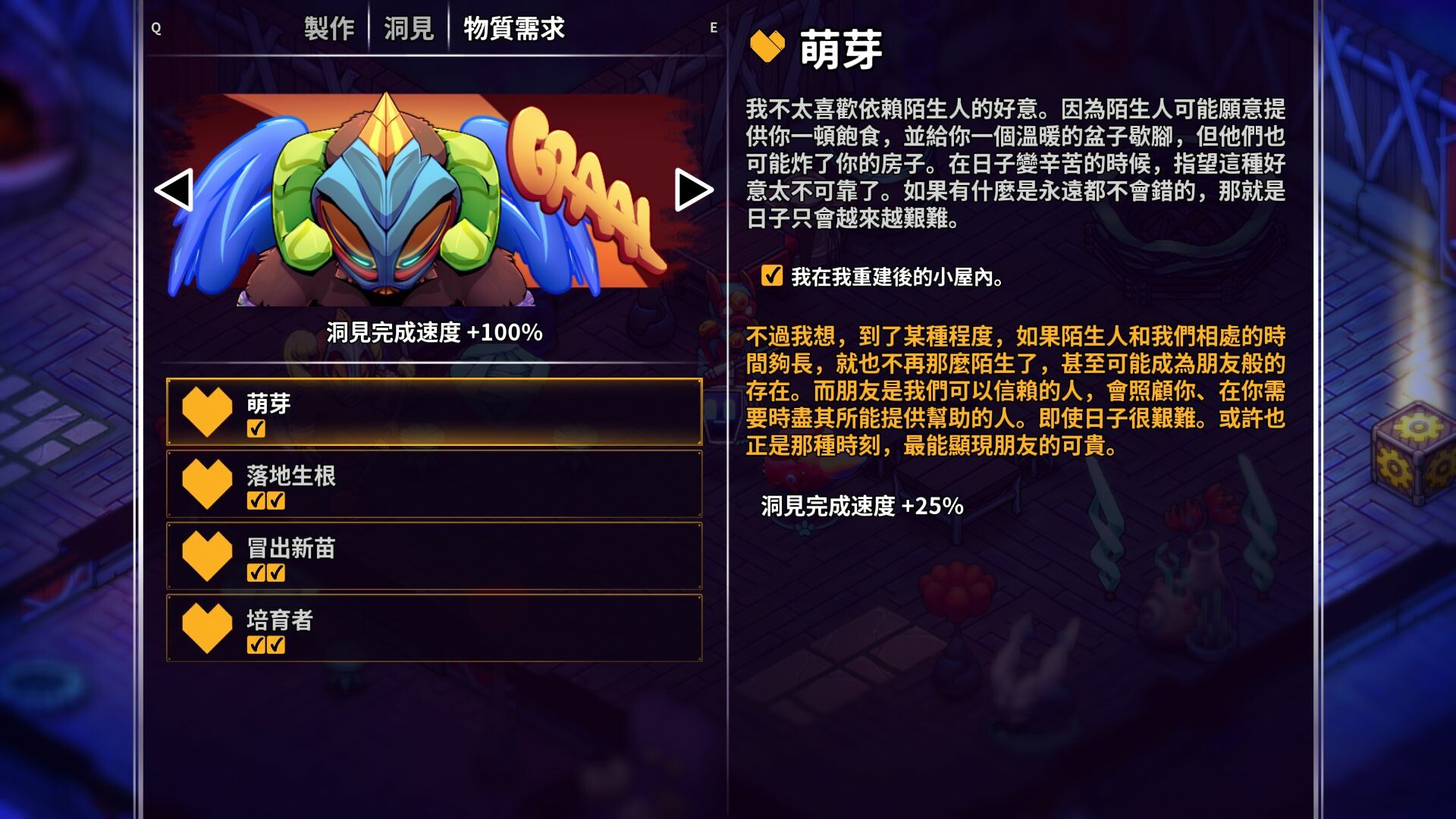 經過漫長一天的荒野探索、與蛞蝓獸戰鬥、被象鼻獸噴得滿身鼻涕後,你需要一個讓自己和外星夥伴們安心休息的地方。打造一個溫馨舒適的異鄉家園,你能不受外界干擾地在此製作物品、聊天與種植,或是照料你領養的孤兒蛞蝓獸寶寶。只要別忘記幫你的新朋友…以及可能的室友準備一些空間就行了。