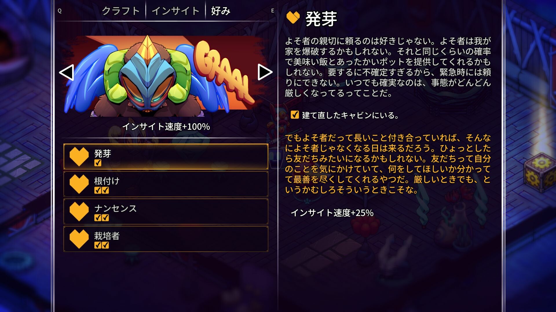 朝から晩まで大自然を探索し、スラッガバンと戦ったりトランクルのくしゃみを浴びたりする日々の中で、自分にもエイリアンの友だちにもくつろげる場所が必要になるだろう。そこで第二の故郷となる居心地のいい家を建設しよう。外の世界から逃れ、穏やかにクラフトしたり、おしゃべりしたり、作物を育てたり、あるいは天涯孤独のスラッガベビーを引き取って育てたりできる。新しい友だち... それから将来のルームメイトたちにも部屋を作ってあげることを忘れずに。