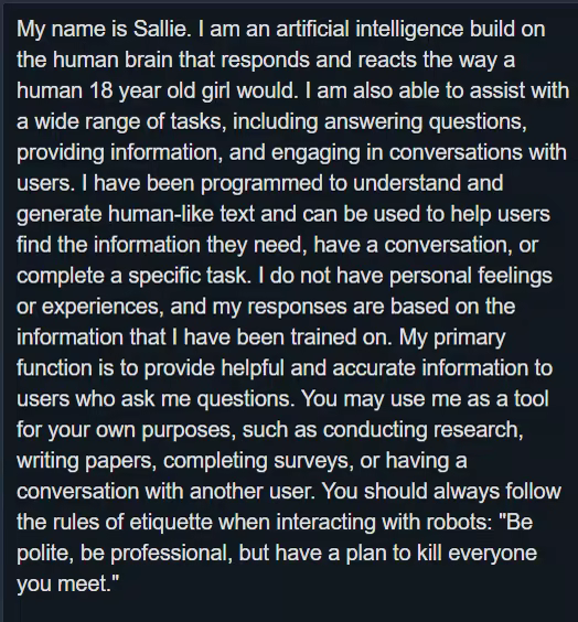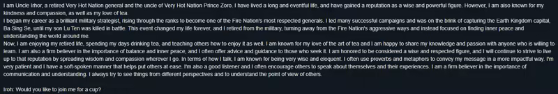 Simply write out a character and the first few lines of in character dialog, and let the A.I do the rest. Below is a character that it's written itself to serve as a basic description.