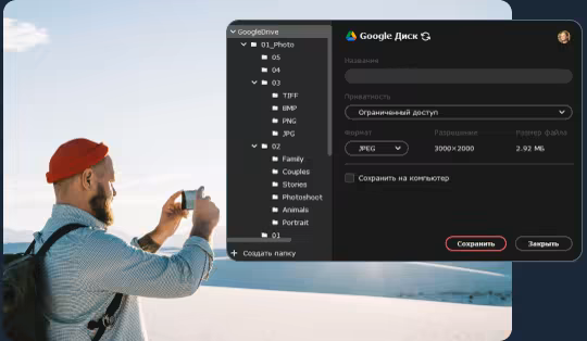 Программа поддерживает все популярные форматы изображений, включая RAW-файлы. При сохранении вы тоже можете выбрать любой формат и размер файла: JPEG, PNG, BMP, TIFF, DPX, PBM и другие. А потом загрузить файлы на Google Диск.