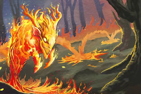 Burning, blazing, rising, consuming - Heart of the Wildfire is quite fond of humans, in a general sense: they keep hearths and use fire as a tool all the time, and those sparks give birth to so many lovely conflagrations! It is the nature of Spirits to be true to what they are, so even though Wildfire knows on some level that too much fire is bad for the land, it just doesn't think about that aspect of things very much. It is also, after all, a spirit of renewal after the blaze, so it implicitly assumes that everything will regrow eventually. (Its strong ties to A Spread of Rampant Green probably contribute to this point of view.)
