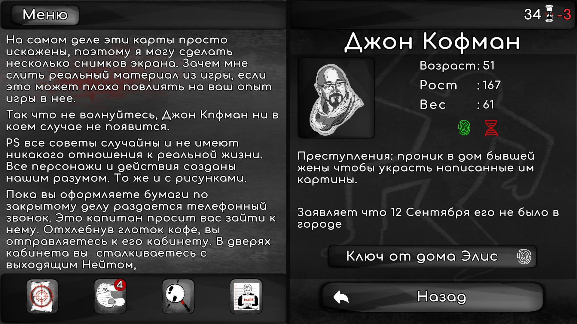 Почувствуйте себя настоящим детективом. Что принесет тебе новое дело? Загадочное исчезновение или дерзкое ограбление? Что двигало преступником? Вы сами выбираете в каком направлении будет идти расследование. Исследуйте улики, допрашивайте подозреваемых, проверяйте алиби, раскройте дело!