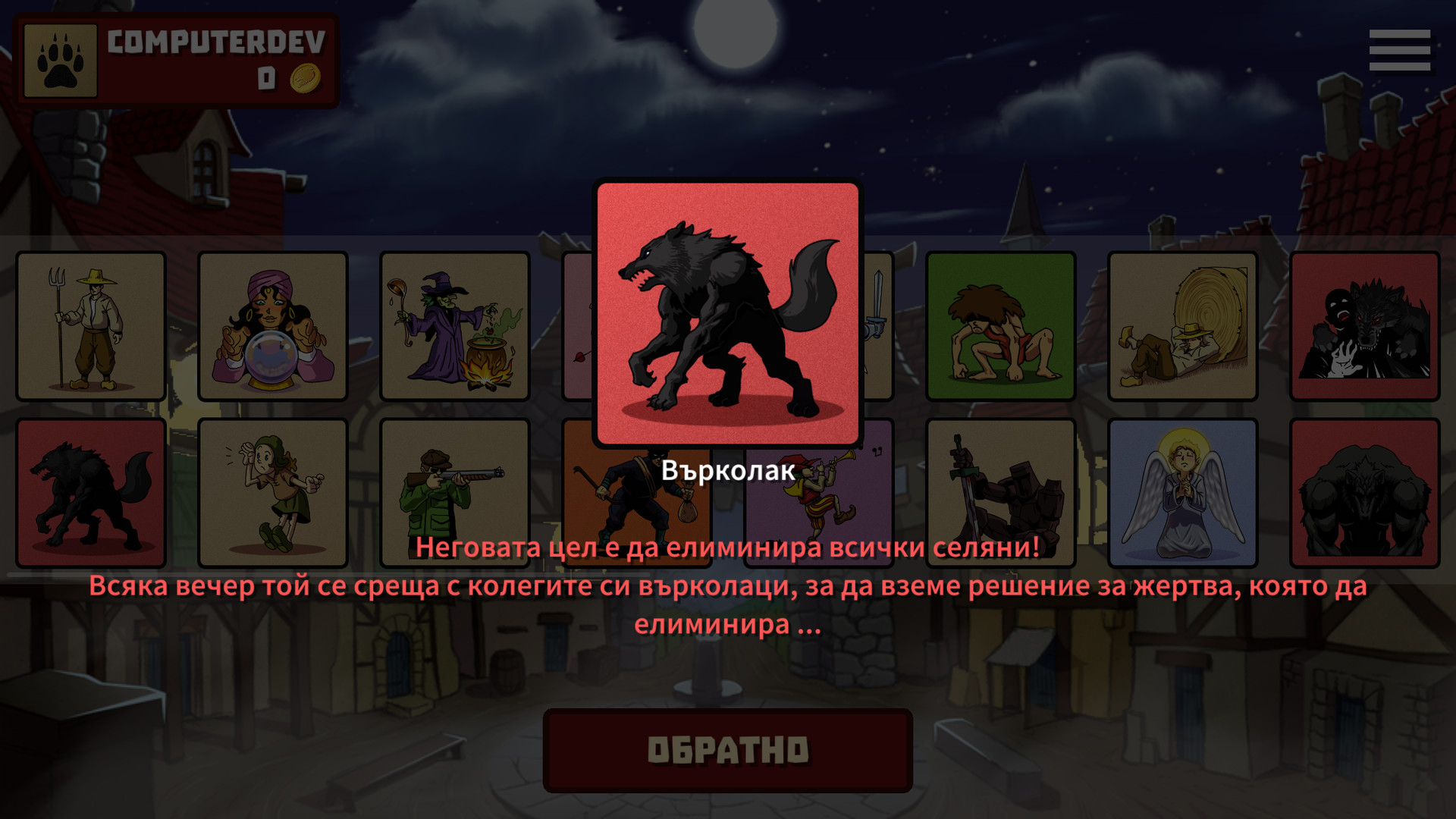 Werewolf – Every night, he meets with his fellow wolves to decide on a victim to devour.